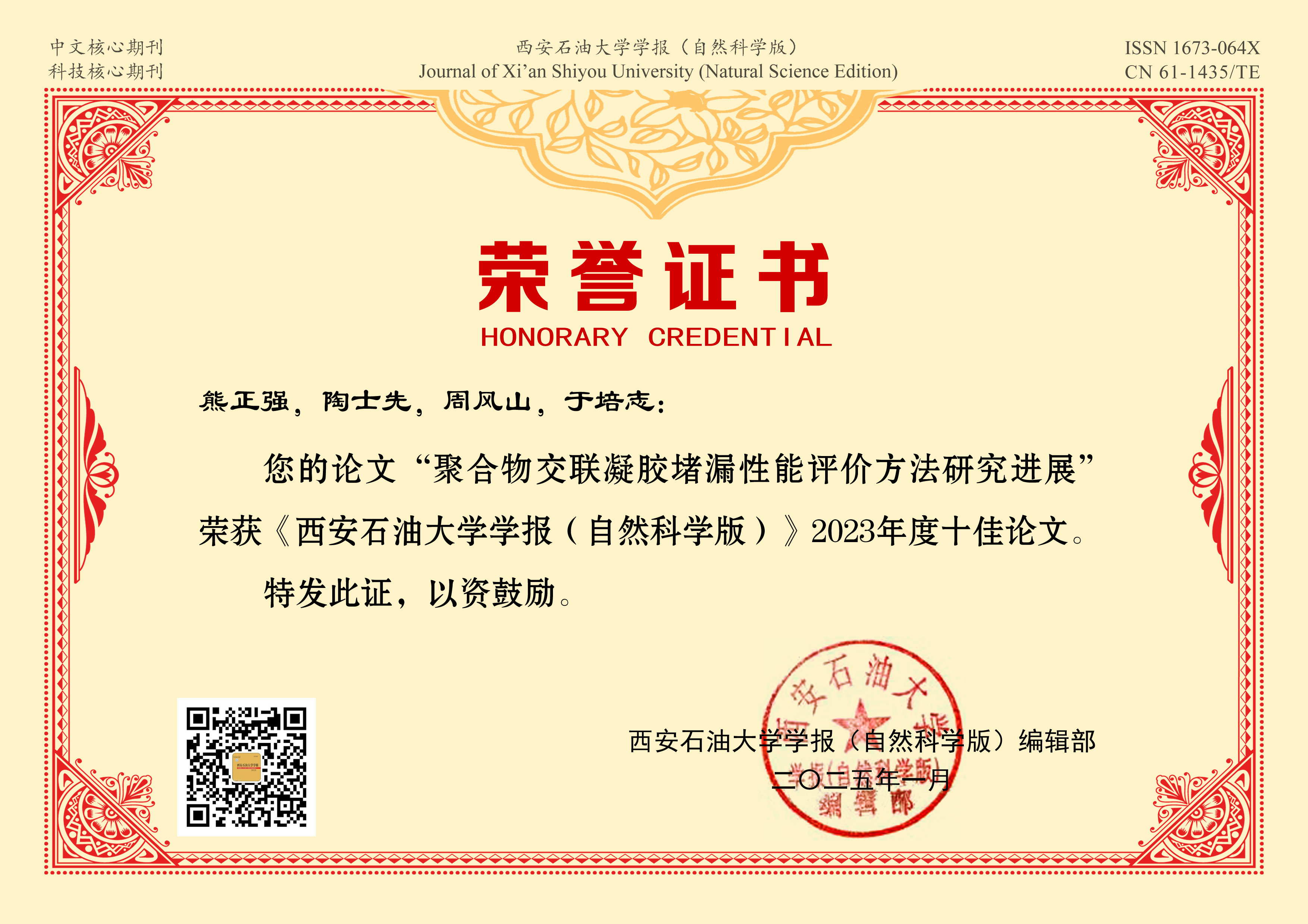 近日,中国地质调查局北京探矿工程研究所熊正强、陶士先等人的论文“聚合物交联凝胶堵漏性能评价方法研究进展”被中文核心期刊《西安石油大学学报(自然科学版)》评选为“2023年度十佳论文”。