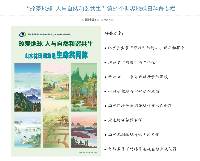 2020年4月22日是第51个世界地球日。自然资源部中国地质调查局北京探矿工程研究所在做好常态化疫情防控工作的前提下,创新工作方式,充分利用网络平台,首次开展了线上主题宣传活动。