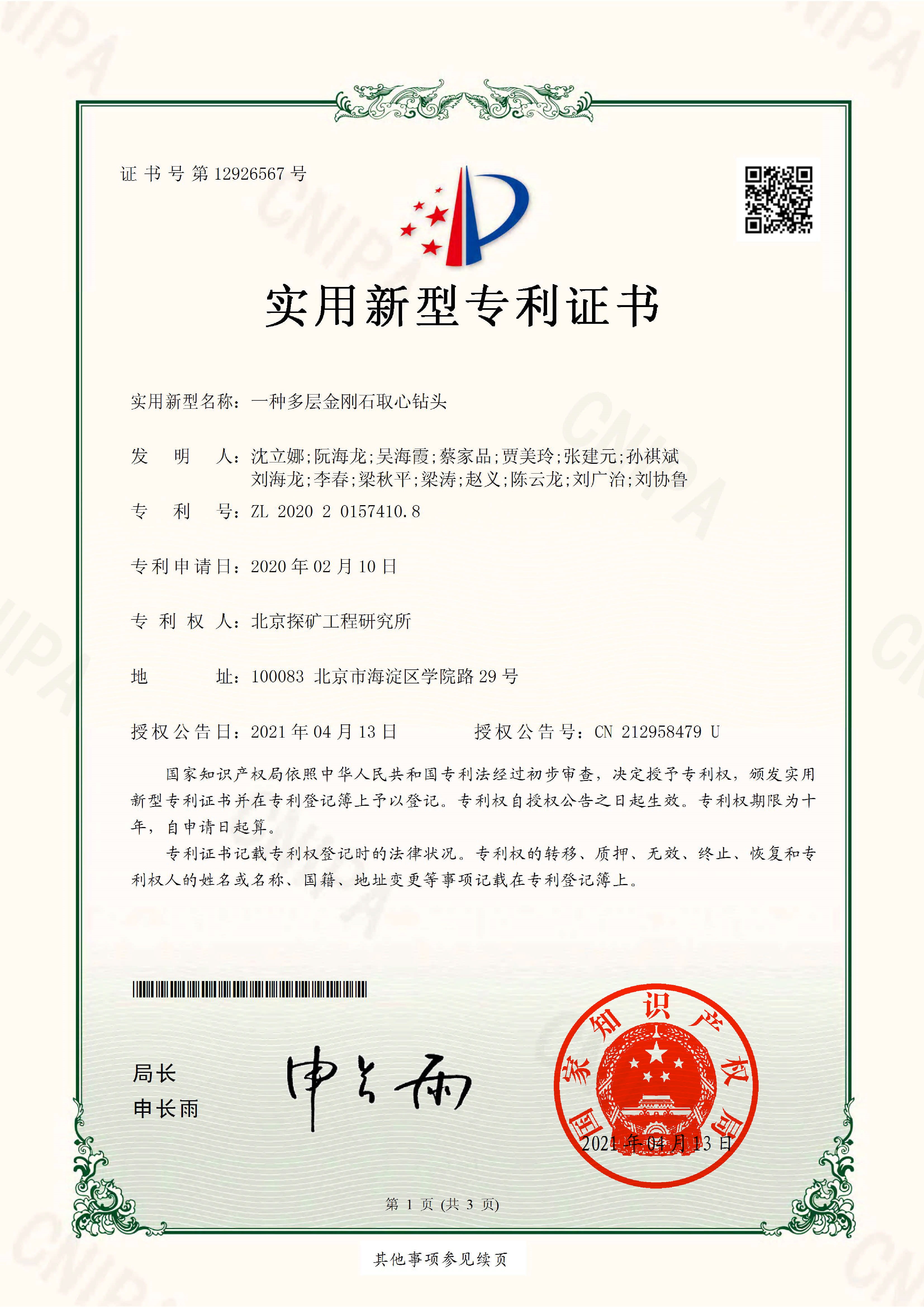 近日,自然资源部中国地质调查局北京探矿工程研究所研发的“一种多层金刚石取心钻头”获国家实用新型专利授权(专利号ZL202020157410.8)。